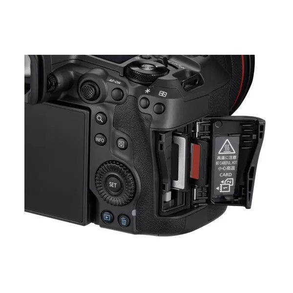 L’appareil est doté de deux emplacements pour cartes mémoire : un emplacement CFexpress de type B pour l’enregistrement de vidéos brutes et la prise de vue en continu rapide, et un emplacement pour carte SD UHS-II pour les sauvegardes ou les prises de vue moins exigeantes en termes de rapidité.